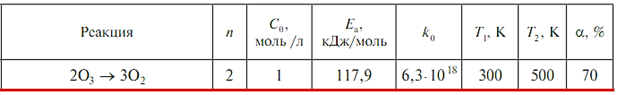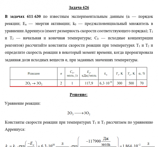 Задача 626 - по известным экспериментальным данным (n — порядок реакции; Ea — энергия активации; k0 — предэкспоненциальный множитель в уравнении Аррениуса (имеет размерность скорости соответствующего порядка); Т1 и Т2 — начальная и конечная температу