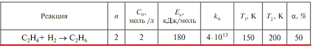 Задача 627 - по известным экспериментальным данным (n — порядок реакции; Ea — энергия активации; k0 — предэкспоненциальный множитель в уравнении Аррениуса (имеет размерность скорости соответствующего порядка); Т1 и Т2 — начальная и конечная температу