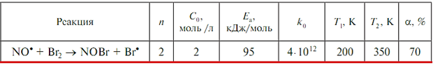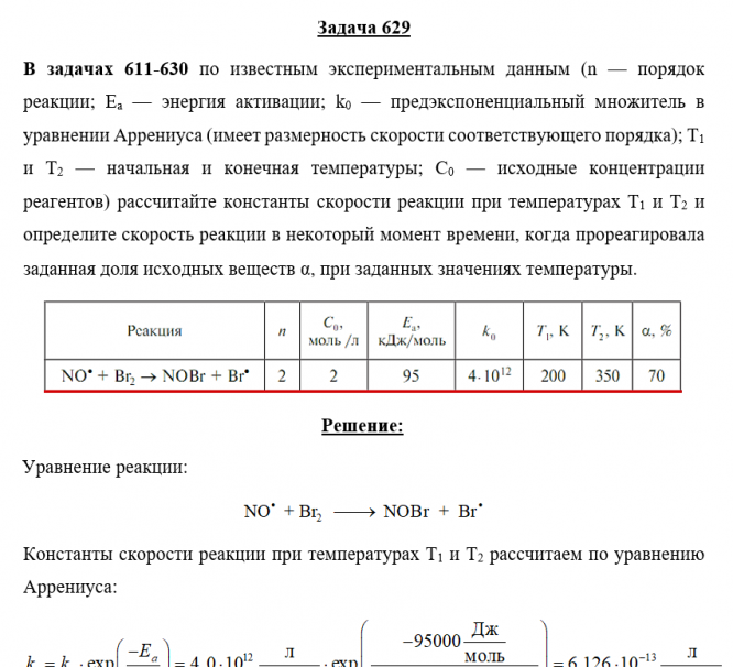 Задача 629 - по известным экспериментальным данным (n — порядок реакции; Ea — энергия активации; k0 — предэкспоненциальный множитель в уравнении Аррениуса (имеет размерность скорости соответствующего порядка); Т1 и Т2 — начальная и конечная температу