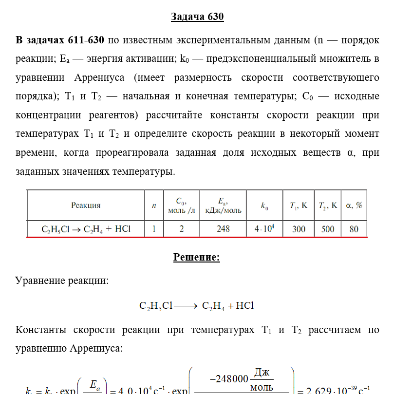 Для студентов по предмету ХимияЗадача 630 - по известным экспериментальным данным (n — порядок реакции; Ea — энергия активации; k0 — предэкспоненциальный множитель в уравнении АрренЗадача 630 - по известным экспериментальным данным (n — порядок реакции; Ea — энергия активации; k0 — предэкспоненциальный множитель в уравнении Аррен