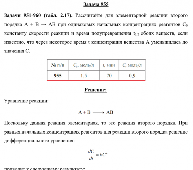 Главная » Учебные материалы » Химия » Решения задач » Несколько классов/семестров » Номер 955 » Задача 955 - Рассчитайте для элементарной реакции второго порядка А + В → АВ при одинаковых начальных концентрациях реагентов С0 константу скорости реакции и время полупревращения t1/2 обоих веществ, если известно, что через некоторое время t концент