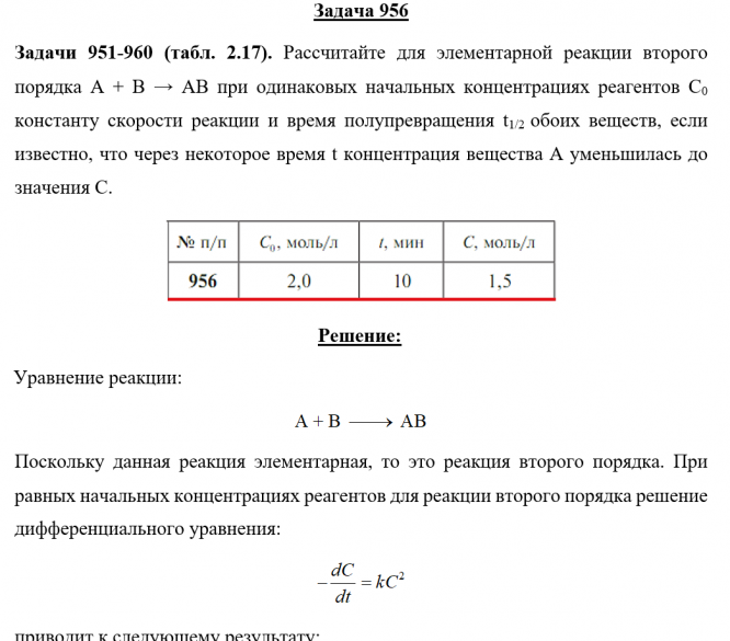 Задача 956 - Рассчитайте для элементарной реакции второго порядка А + В → АВ при одинаковых начальных концентрациях реагентов С0 константу скорости реакции и время полупревращения t1/2 обоих веществ, если известно, что через некоторое время t концент