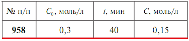 Задачи 951-960 (табл. 2.17). Рассчитайте для элементарной реакции второго порядка А + В → АВ при одинаковых начальных концентрациях реагентов С0 константу скорости реакции и время полупревращения t1/2 обоих веществ, если известно, что через некоторое время t концентрация вещества А уменьшилась до значения С.