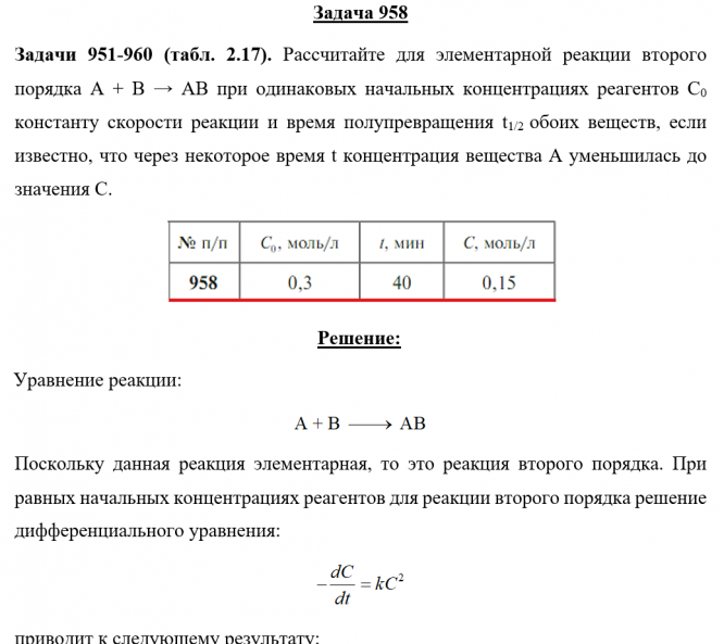 Главная » Учебные материалы » Химия » Решения задач » Несколько классов/семестров » Номер 958 » Задача 958 - Рассчитайте для элементарной реакции второго порядка А + В → АВ при одинаковых начальных концентрациях реагентов С0 константу скорости реакции и время полупревращения t1/2 обоих веществ, если известно, что через некоторое время t концент