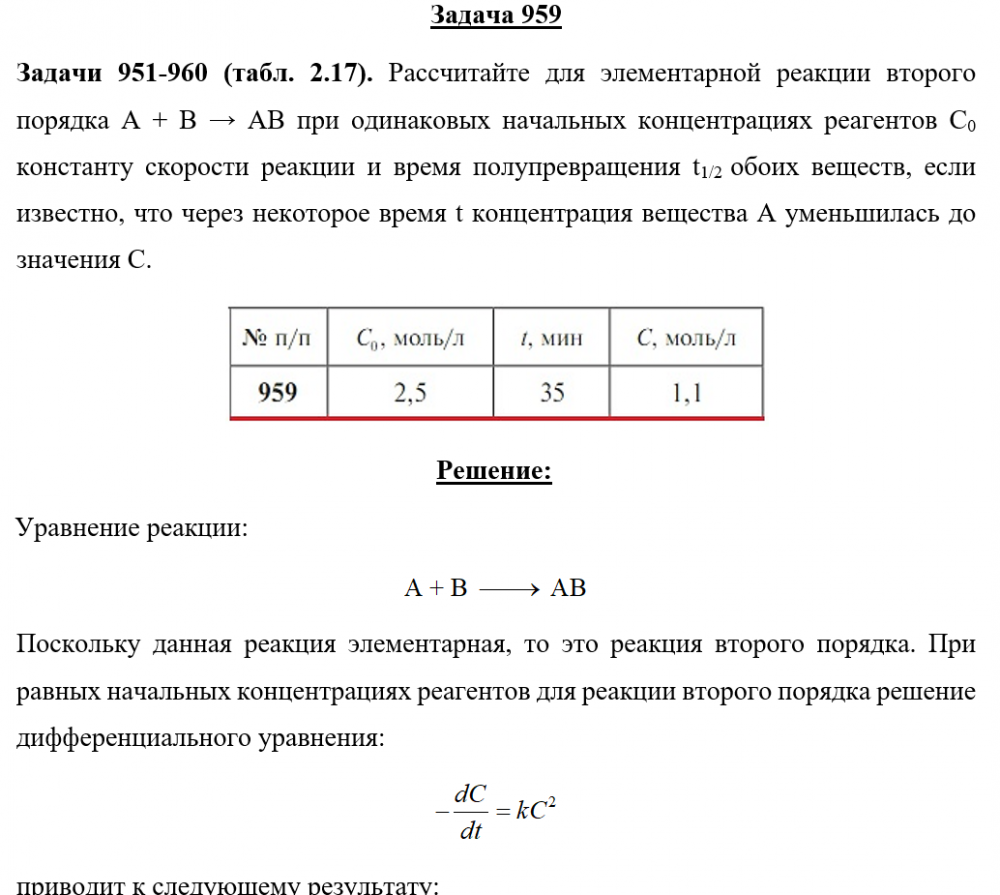 Задача 959 - Рассчитайте для элементарной реакции второго порядка А + В → АВ при одинаковых начальных концентрациях реагентов С0 константу скорости реакции и время полупревращения t1/2 обоих веществ, если известно, что через некоторое время t концент