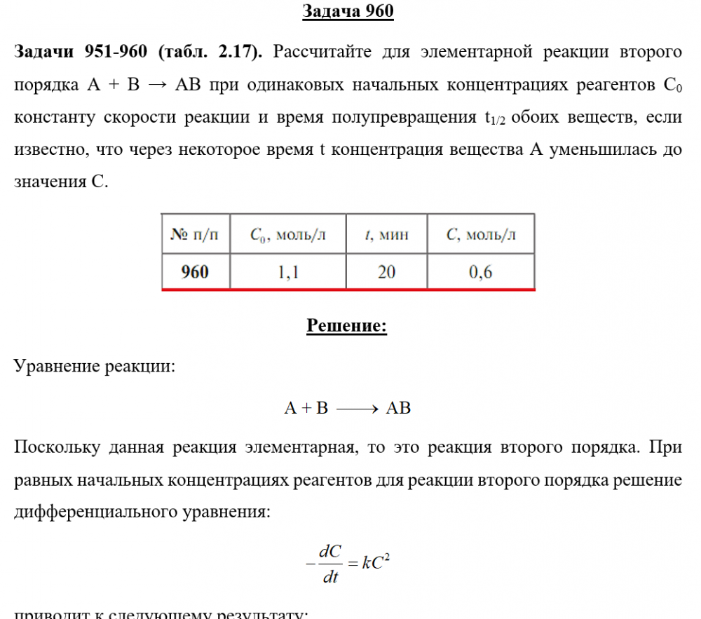 Задача 960 - Рассчитайте для элементарной реакции второго порядка А + В → АВ при одинаковых начальных концентрациях реагентов С0 константу скорости реакции и время полупревращения t1/2 обоих веществ, если известно, что через некоторое время t концент