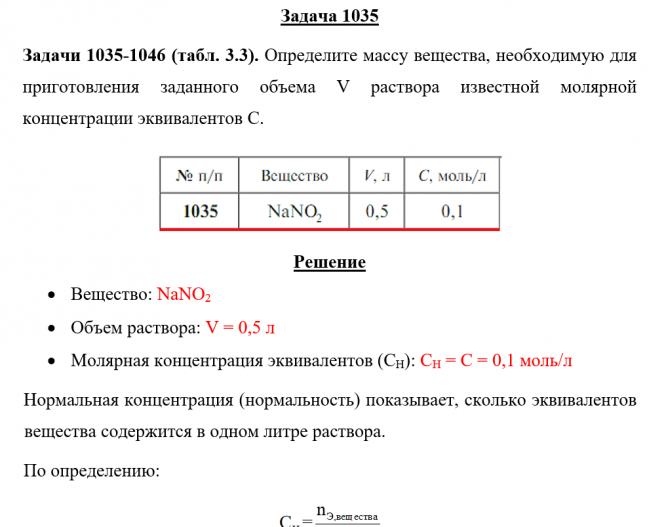Задачи 1035-1046 (табл. 3.3). Определите массу вещества, необходимую для приготовления заданного объема V раствора известной молярной концентрации эквивалентов С.