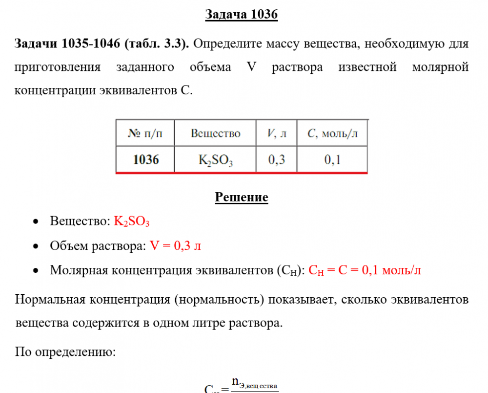 Задачи 1035-1046 (табл. 3.3). Определите массу вещества, необходимую для приготовления заданного объема V раствора известной молярной концентрации эквивалентов С.