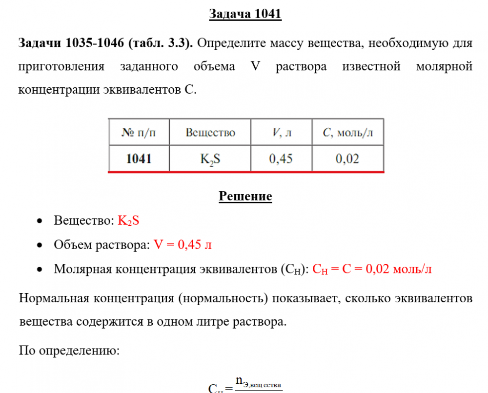 Для студентов по предмету ХимияЗадача 1041 - Определите массу вещества, необходимую для приготовления заданного объема V раствора известной молярной концентрации эквивалентов С.Задача 1041 - Определите массу вещества, необходимую для приготовления заданного объема V раствора известной молярной концентрации эквивалентов С.
