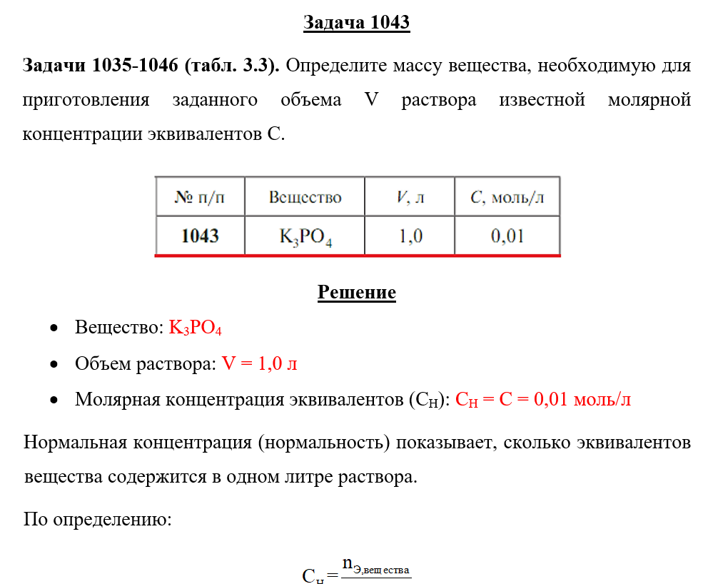 Задачи 1035-1046 (табл. 3.3). Определите массу вещества, необходимую для приготовления заданного объема V раствора известной молярной концентрации эквивалентов С.