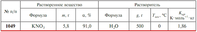 Задача 1049 - Определите температуру начала кристаллизации раствора (m — масса растворенного вещества; α — степень диссоциации электролита; g — масса растворителя; Тзам — температура замерзания растворителя; Кзам — криоскопическая постоянная).