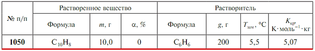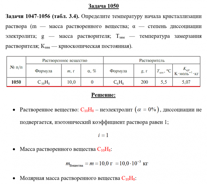 Задача 1050 - Определите температуру начала кристаллизации раствора (m — масса растворенного вещества; α — степень диссоциации электролита; g — масса растворителя; Тзам — температура замерзания растворителя; Кзам — криоскопическая постоянная).
