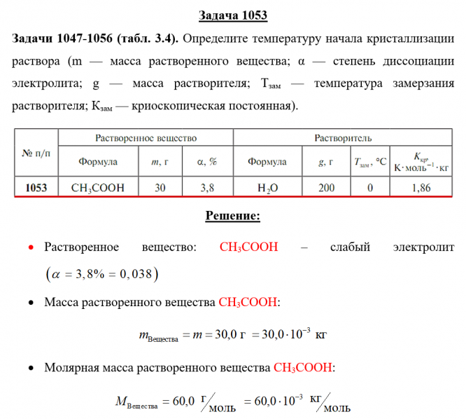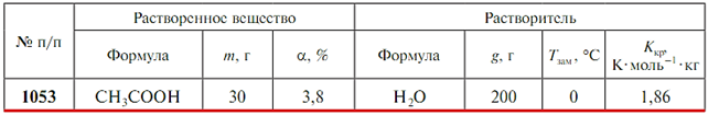 Задача 1053 - Определите температуру начала кристаллизации раствора (m — масса растворенного вещества; α — степень диссоциации электролита; g — масса растворителя; Тзам — температура замерзания растворителя; Кзам — криоскопическая постоянная).