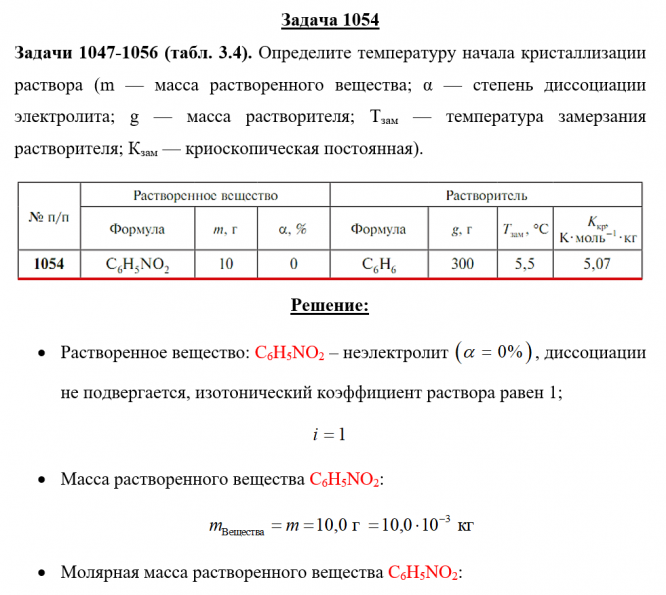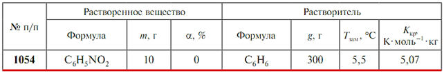Задача 1054 - Определите температуру начала кристаллизации раствора (m — масса растворенного вещества; α — степень диссоциации электролита; g — масса растворителя; Тзам — температура замерзания растворителя; Кзам — криоскопическая постоянная).
