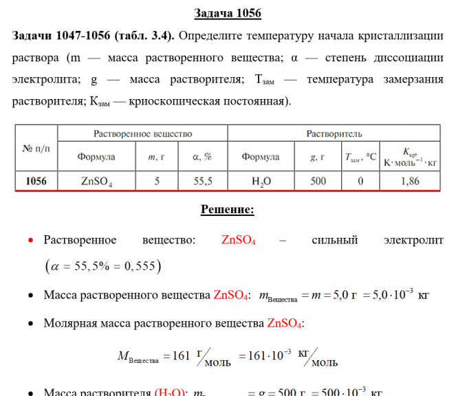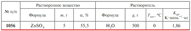 Задача 1056 - Определите температуру начала кристаллизации раствора (m — масса растворенного вещества; α — степень диссоциации электролита; g — масса растворителя; Тзам — температура замерзания растворителя; Кзам — криоскопическая постоянная).