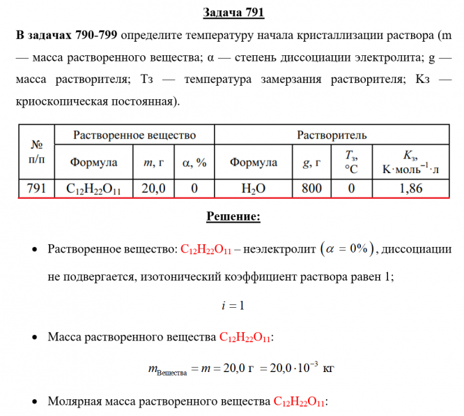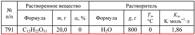 Задача 791 - определите температуру начала кристаллизации раствора (m — масса растворенного вещества; α — степень диссоциации электролита; g — масса растворителя; Тз — темпера-тура замерзания растворителя; Kз — криоскопическая постоянная).