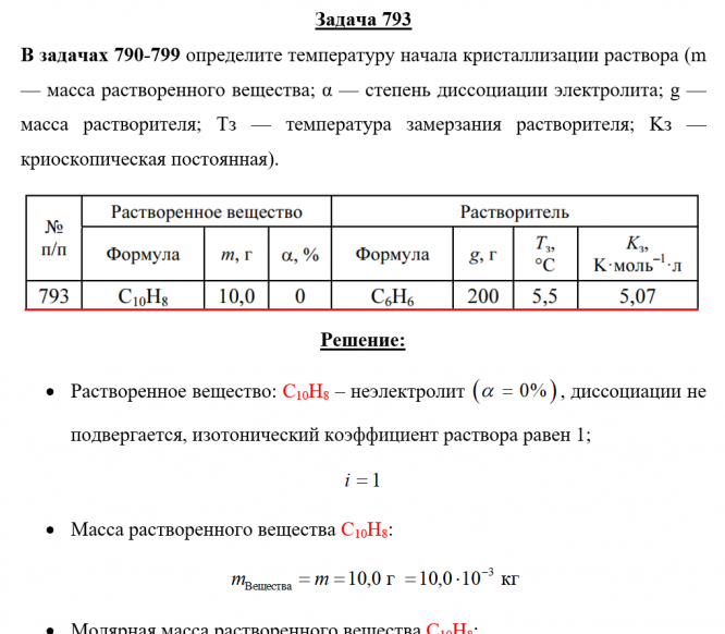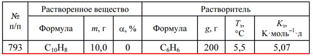 Задача 793 - определите температуру начала кристаллизации раствора (m — масса растворенного вещества; α — степень диссоциации электролита; g — масса растворителя; Тз — темпера-тура замерзания растворителя; Kз — криоскопическая постоянная).