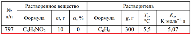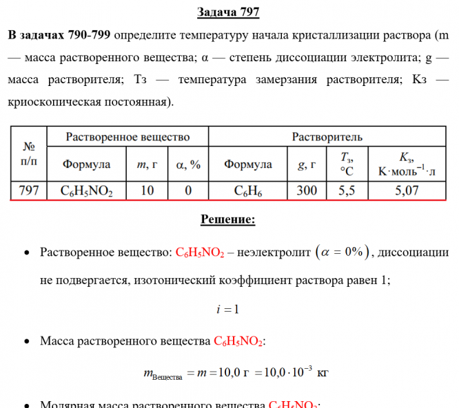 Задача 797 - определите температуру начала кристаллизации раствора (m — масса растворенного вещества; α — степень диссоциации электролита; g — масса растворителя; Тз — темпера-тура замерзания растворителя; Kз — криоскопическая постоянная).