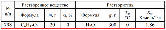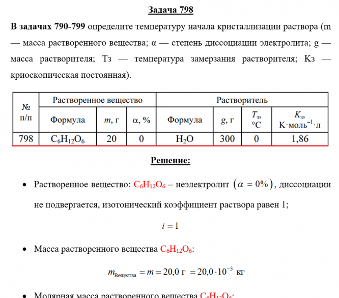 Задача 798 - определите температуру начала кристаллизации раствора (m — масса растворенного вещества; α — степень диссоциации электролита; g — масса растворителя; Тз — темпера-тура замерзания растворителя; Kз — криоскопическая постоянная).
