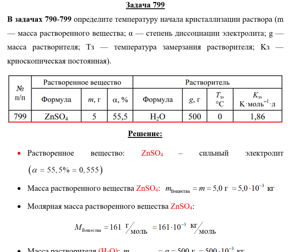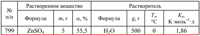 Задача 799 - определите температуру начала кристаллизации раствора (m — масса растворенного вещества; α — степень диссоциации электролита; g — масса растворителя; Тз — темпера-тура замерзания растворителя; Kз — криоскопическая постоянная).