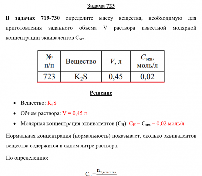 Задача 723 - определите массу вещества, необходимую для приготовления заданного объема V раствора известной моляр-ной концентрации эквивалента Сэкв.