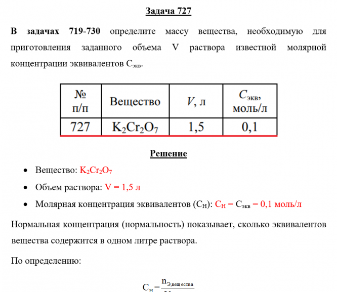 Задача 727 - определите массу вещества, необходимую для приготовления заданного объема V раствора известной моляр-ной концентрации эквивалента Сэкв.