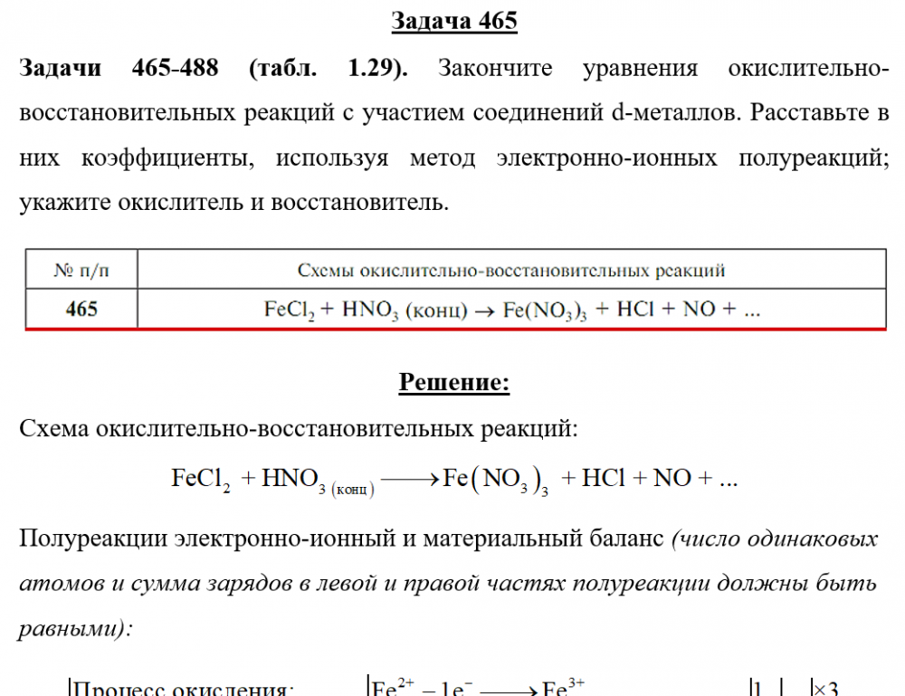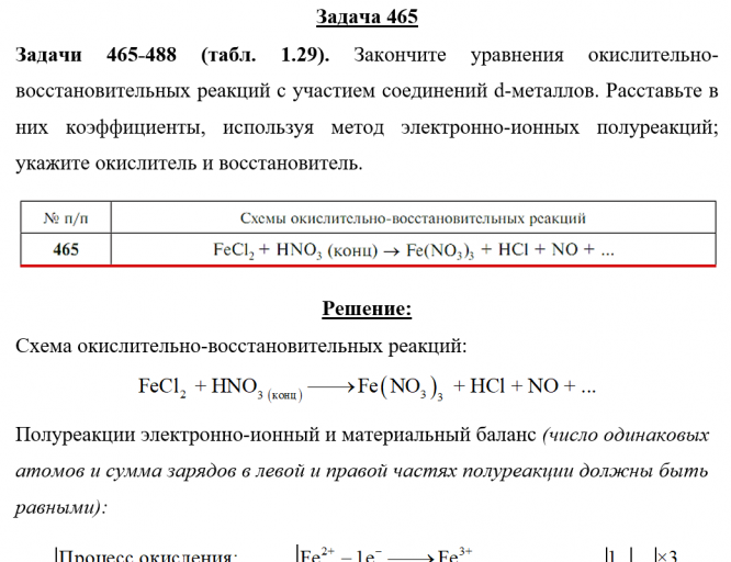 Задачи 465-488 (табл. 1.29). Закончите уравнения окислительно-восстановительных реакций с участием соединений d-металлов. Расставьте в них коэффициенты, используя метод электронно-ионных полуреакций; укажите окислитель и восстановитель..