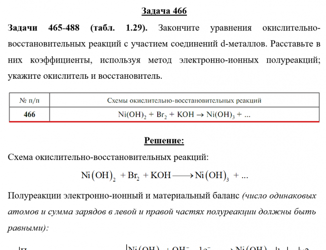 Задачи 465-488 (табл. 1.29). Закончите уравнения окислительно-восстановительных реакций с участием соединений d-металлов. Расставьте в них коэффициенты, используя метод электронно-ионных полуреакций; укажите окислитель и восстановитель..