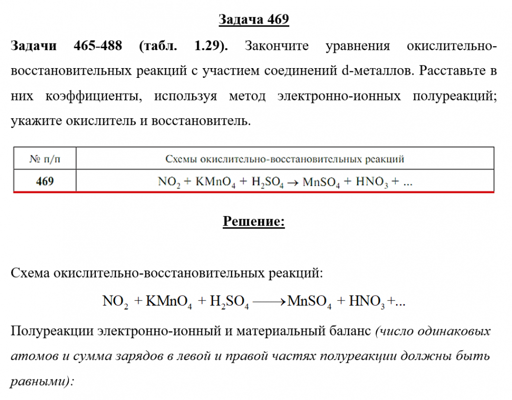 Задачи 465-488 (табл. 1.29). Закончите уравнения окислительно-восстановительных реакций с участием соединений d-металлов. Расставьте в них коэффициенты, используя метод электронно-ионных полуреакций; укажите окислитель и восстановитель.