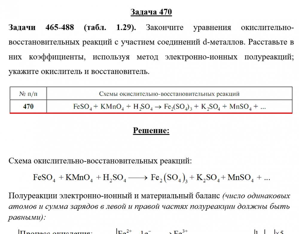 Задачи 465-488 (табл. 1.29). Закончите уравнения окислительно-восстановительных реакций с участием соединений d-металлов. Расставьте в них коэффициенты, используя метод электронно-ионных полуреакций; укажите окислитель и восстановитель.