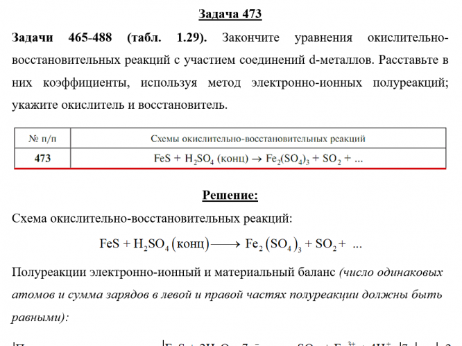Задачи 465-488 (табл. 1.29). Закончите уравнения окислительно-восстановительных реакций с участием соединений d-металлов. Расставьте в них коэффициенты, используя метод электронно-ионных полуреакций; укажите окислитель и восстановитель..