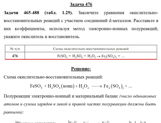 Задачи 465-488 (табл. 1.29). Закончите уравнения окислительно-восстановительных реакций с участием соединений d-металлов. Расставьте в них коэффициенты, используя метод электронно-ионных полуреакций; укажите окислитель и восстановитель..