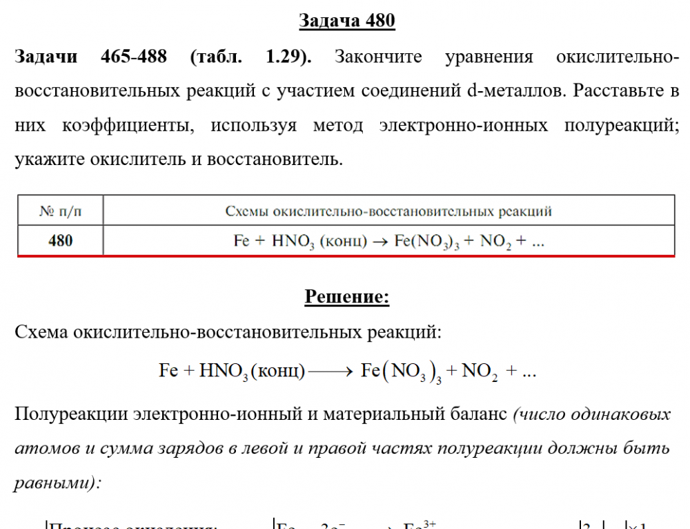 Задачи 465-488 (табл. 1.29). Закончите уравнения окислительно-восстановительных реакций с участием соединений d-металлов. Расставьте в них коэффициенты, используя метод электронно-ионных полуреакций; укажите окислитель и восстановитель.