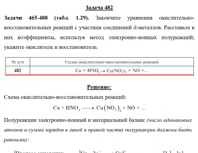 Задачи 465-488 (табл. 1.29). Закончите уравнения окислительно-восстановительных реакций с участием соединений d-металлов. Расставьте в них коэффициенты, используя метод электронно-ионных полуреакций; укажите окислитель и восстановитель..