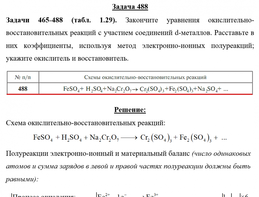 Задачи 465-488 (табл. 1.29). Закончите уравнения окислительно-восстановительных реакций с участием соединений d-металлов. Расставьте в них коэффициенты, используя метод электронно-ионных полуреакций; укажите окислитель и восстановитель.