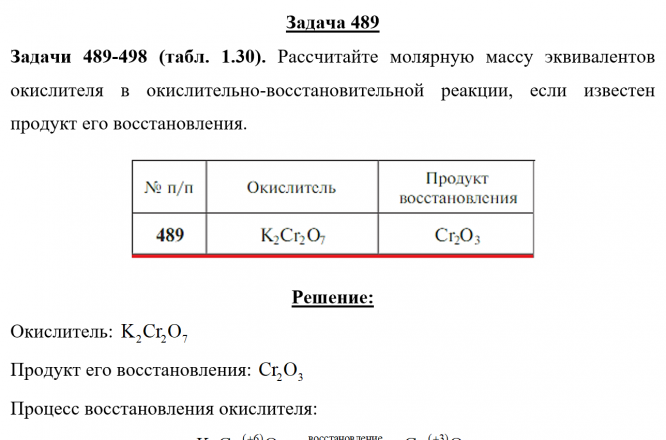 Задачи 489-498 (табл. 1.30). Рассчитайте молярную массу эквивалентов окислителя в окислительно-восстановительной реакции, если известен продукт его восстановления.