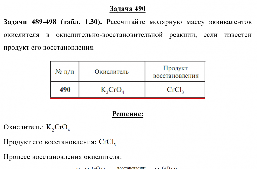 Задачи 489-498 (табл. 1.30). Рассчитайте молярную массу эквивалентов окислителя в окислительно-восстановительной реакции, если известен продукт его восстановления.