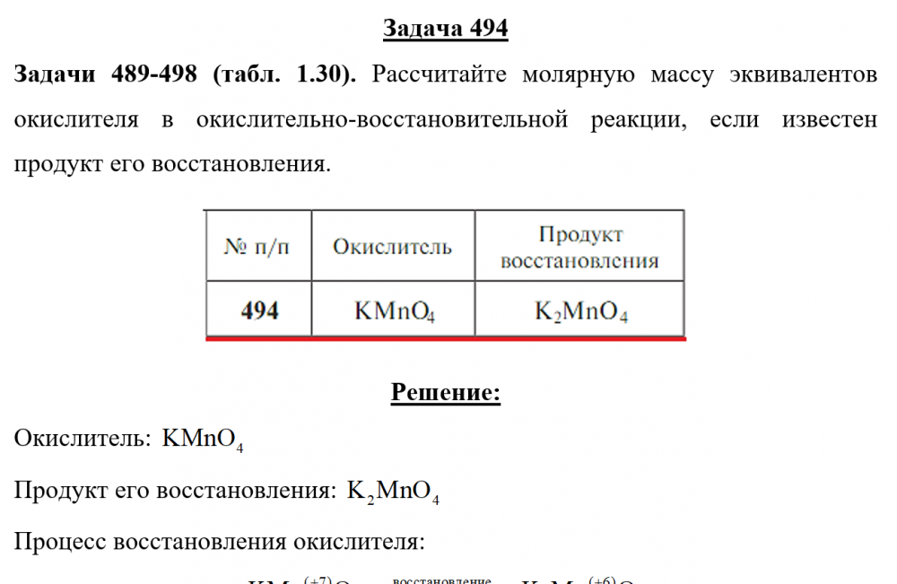 Показать/скрыть дополнительное описаниеЗадачи 489-498 (табл. 1.30). Рассчитайте молярную массу эквивалентов окислителя в окислительно-восстановительной реакции, если известен продукт его восстановления..