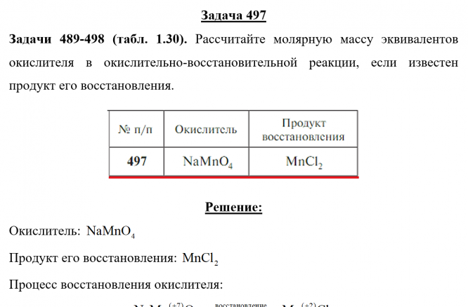 Задача 497 - Рассчитайте молярную массу эквивалентов окислителя в окислительно-восстановительной реакции, если известен продукт его восстановления.