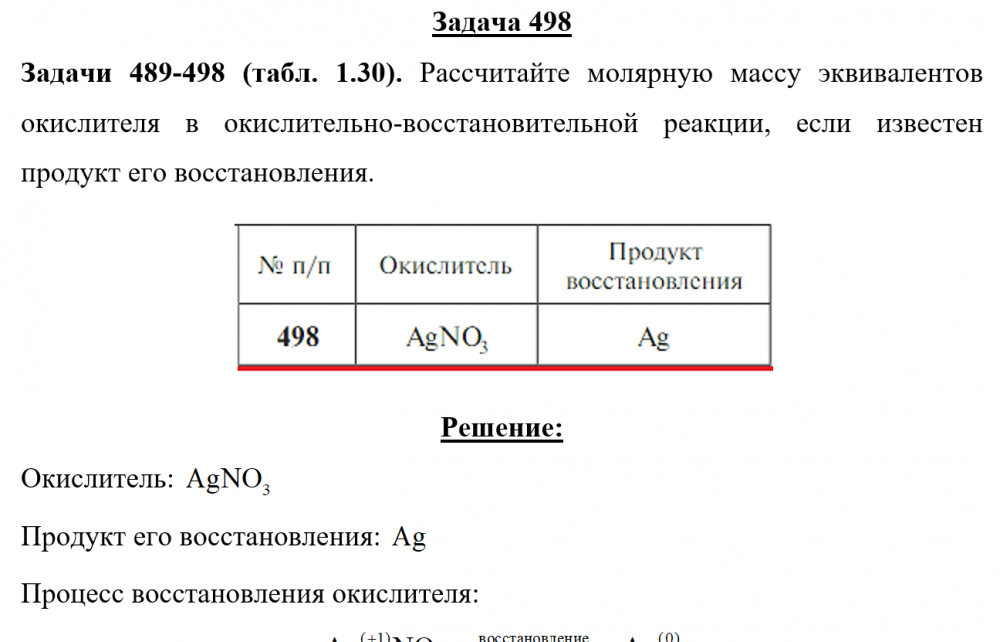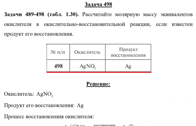 Задача 498 - Рассчитайте молярную массу эквивалентов окислителя в окислительно-восстановительной реакции, если известен продукт его восстановления.
