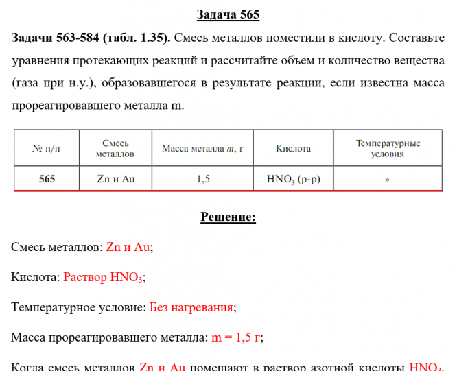 Задачи 563-584 (табл. 1.35). Смесь металлов поместили в кислоту. Составьте уравнения протекающих реакций и рассчитайте объем и количество вещества (газа при н.у.), образовавшегося в результате реакции, если известна масса прореагировавшего металла m.