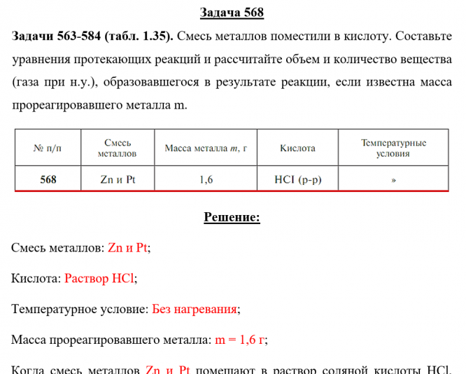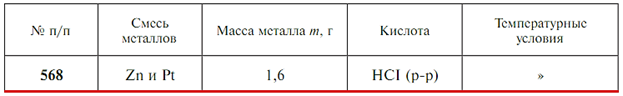 Задачи 563-584 (табл. 1.35). Смесь металлов поместили в кислоту. Составьте уравнения протекающих реакций и рассчитайте объем и количество вещества (газа при н.у.), образовавшегося в результате реакции, если известна масса прореагировавшего металла m.