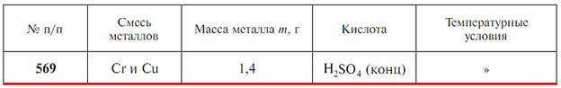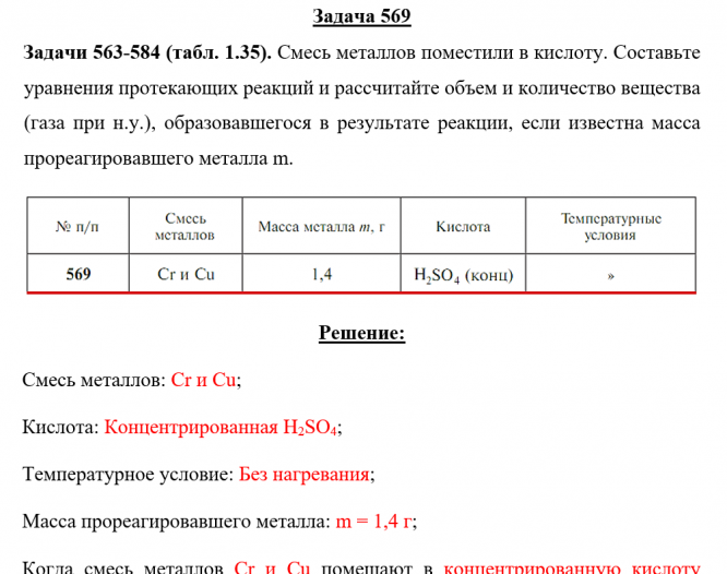 Задачи 563-584 (табл. 1.35). Смесь металлов поместили в кислоту. Составьте уравнения протекающих реакций и рассчитайте объем и количество вещества (газа при н.у.), образовавшегося в результате реакции, если известна масса прореагировавшего металла m.