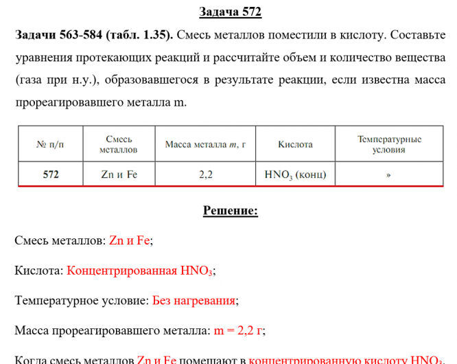 Задачи 563-584 (табл. 1.35). Смесь металлов поместили в кислоту. Составьте уравнения протекающих реакций и рассчитайте объем и количество вещества (газа при н.у.), образовавшегося в результате реакции, если известна масса прореагировавшего металла m.