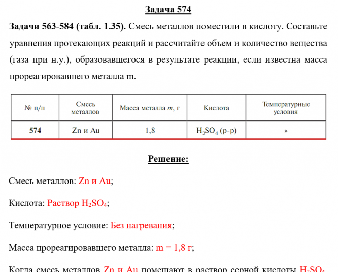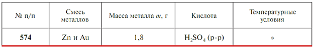 Задачи 563-584 (табл. 1.35). Смесь металлов поместили в кислоту. Составьте уравнения протекающих реакций и рассчитайте объем и количество вещества (газа при н.у.), образовавшегося в результате реакции, если известна масса прореагировавшего металла m.