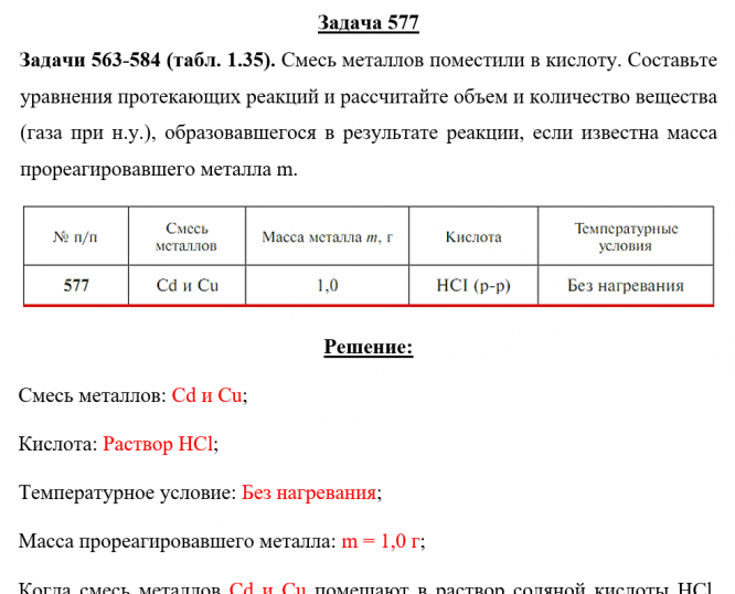 Задачи 563-584 (табл. 1.35). Смесь металлов поместили в кислоту. Составьте уравнения протекающих реакций и рассчитайте объем и количество вещества (газа при н.у.), образовавшегося в результате реакции, если известна масса прореагировавшего металла m.