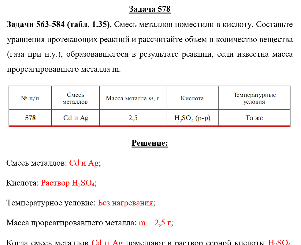 Для студентов по предмету ХимияЗадача 578 - Смесь металлов поместили в кислоту. Составьте уравнения протекающих реакций и рассчитайте объем и количество вещества (газа при н.у.), обЗадача 578 - Смесь металлов поместили в кислоту. Составьте уравнения протекающих реакций и рассчитайте объем и количество вещества (газа при н.у.), об