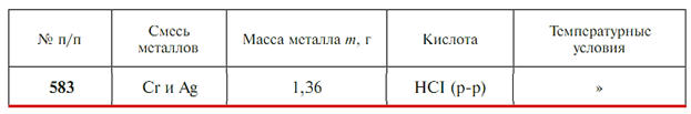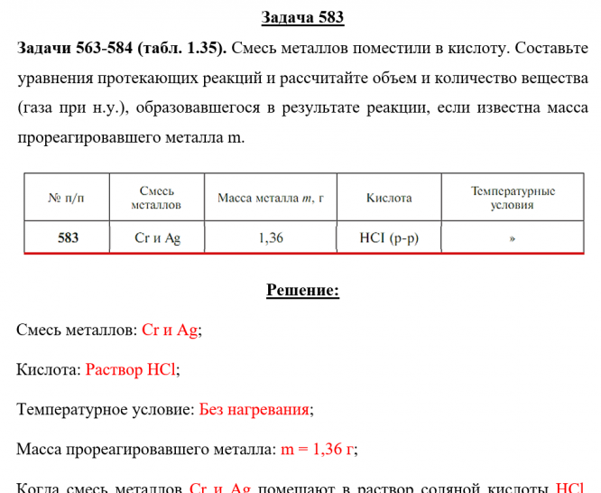 Задачи 563-584 (табл. 1.35). Смесь металлов поместили в кислоту. Составьте уравнения протекающих реакций и рассчитайте объем и количество вещества (газа при н.у.), образовавшегося в результате реакции, если известна масса прореагировавшего металла m.