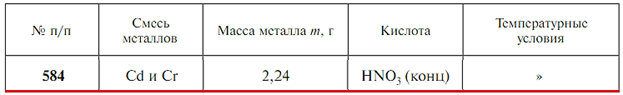 Задачи 563-584 (табл. 1.35). Смесь металлов поместили в кислоту. Составьте уравнения протекающих реакций и рассчитайте объем и количество вещества (газа при н.у.), образовавшегося в результате реакции, если известна масса прореагировавшего металла m.