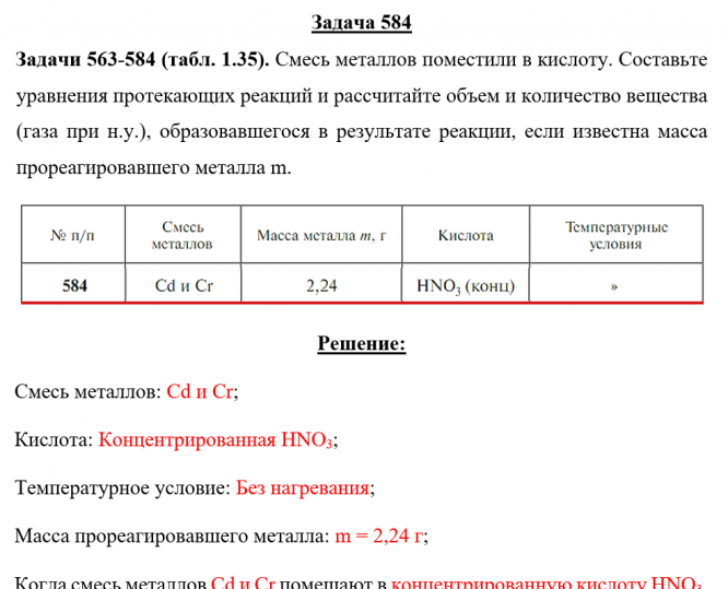 Для студентов по предмету ХимияЗадача 584 - Смесь металлов поместили в кислоту. Составьте уравнения протекающих реакций и рассчитайте объем и количество вещества (газа при н.у.), обЗадача 584 - Смесь металлов поместили в кислоту. Составьте уравнения протекающих реакций и рассчитайте объем и количество вещества (газа при н.у.), об